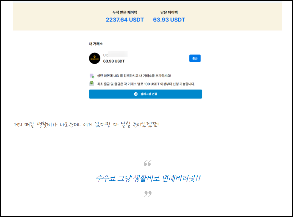 테더페이백 바이낸스 셀퍼럴 200불 환급 완료 수수료를 아껴야 한다. 나는 한 달에 수수료만 500~600불 쓴...